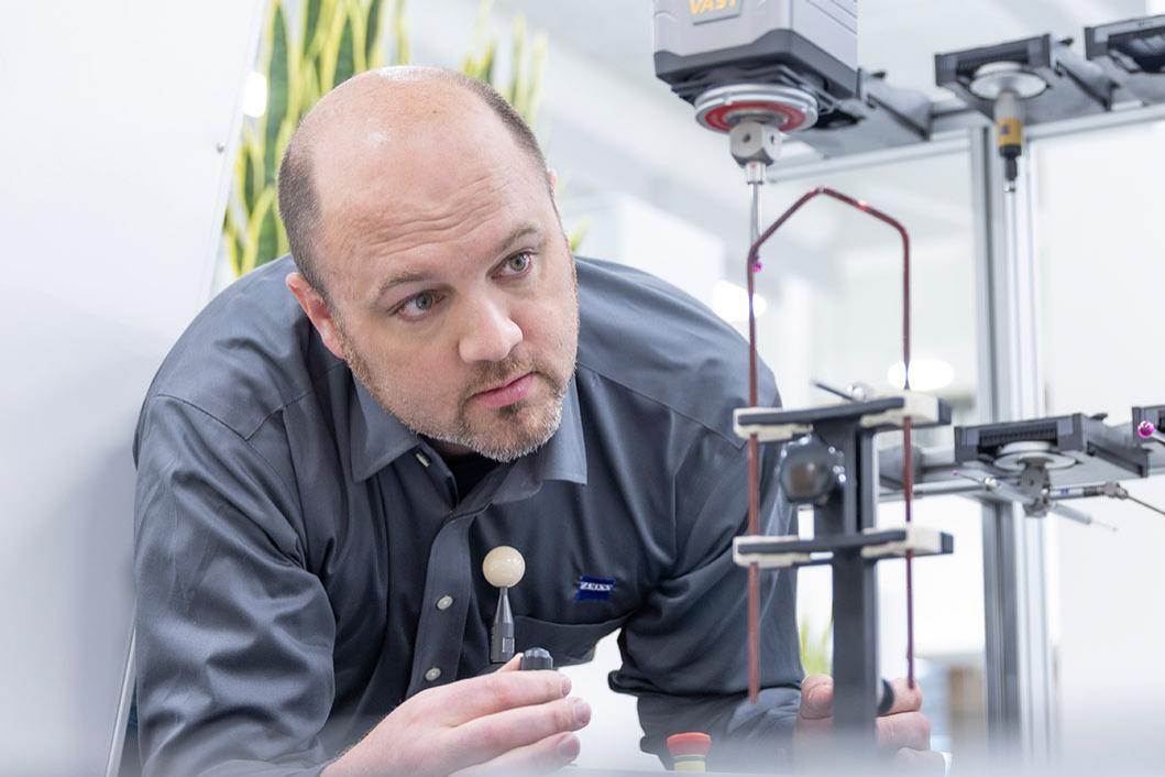 Jeff in einem Labor mit grauem Hemd arbeitet mit dem ZEISS VAST XXT taktilen Scanning Sensor.