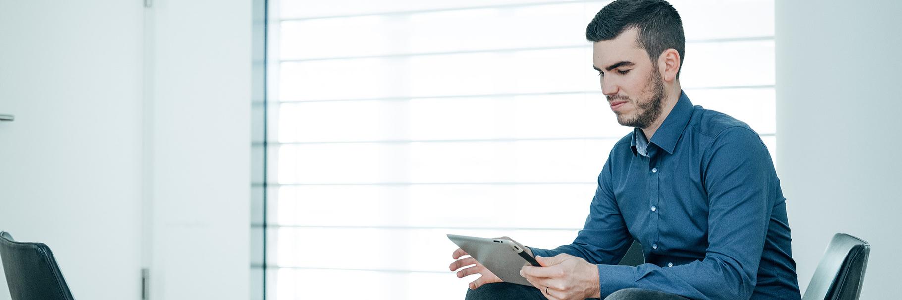 Martin sitzt in einem hellen modernen Raum und schaut konzentriert auf ein Tablet