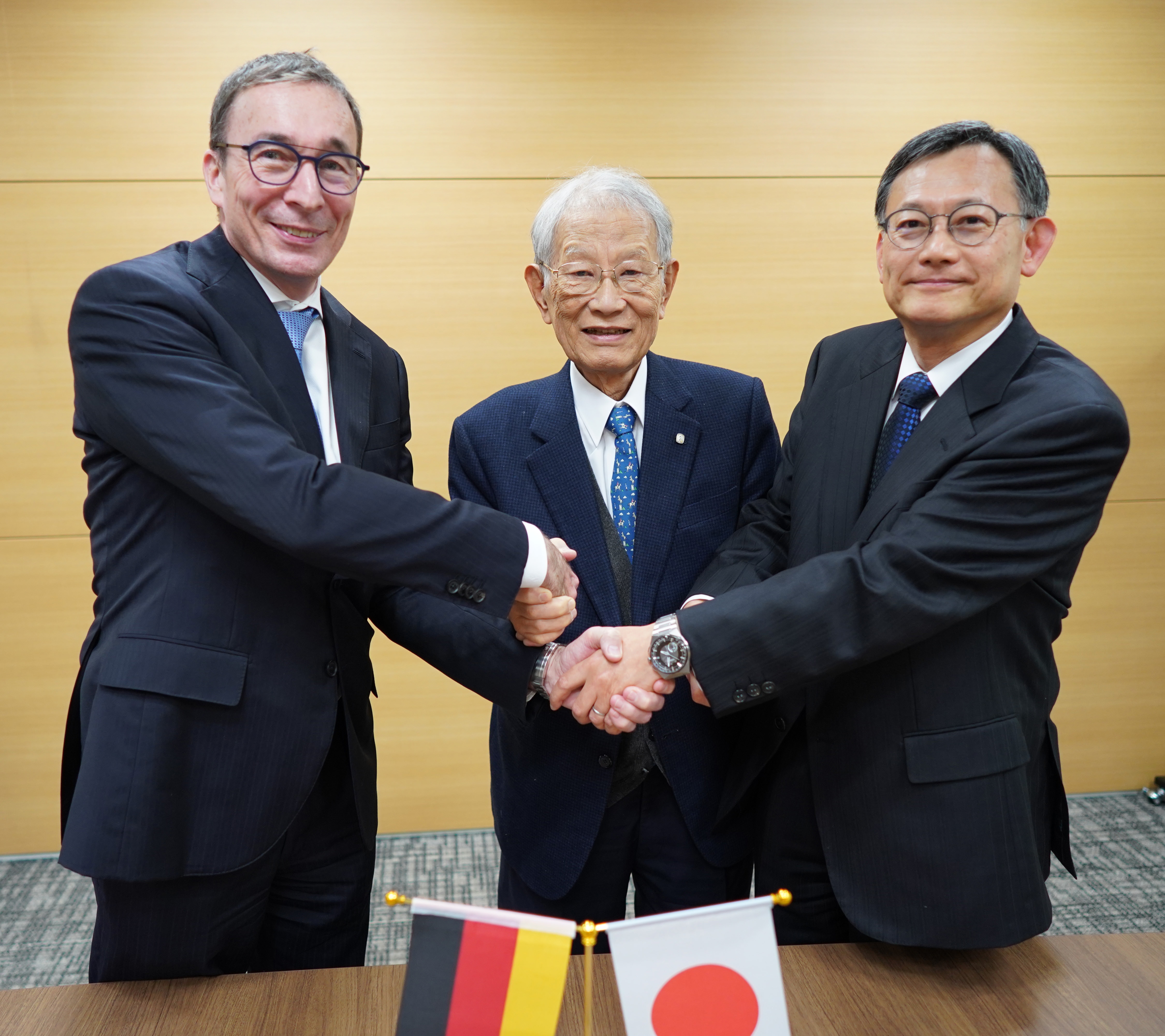 Signing of the strategic collaboration agreement: Dr. Stefan Sacré, Head of ZEISS in Japan, Prof. Dr. Hiroshi Matsumoto, President of RIKEN, and Dr. Yoshihiro Aburatani, President RIKEN Innovation (from left).