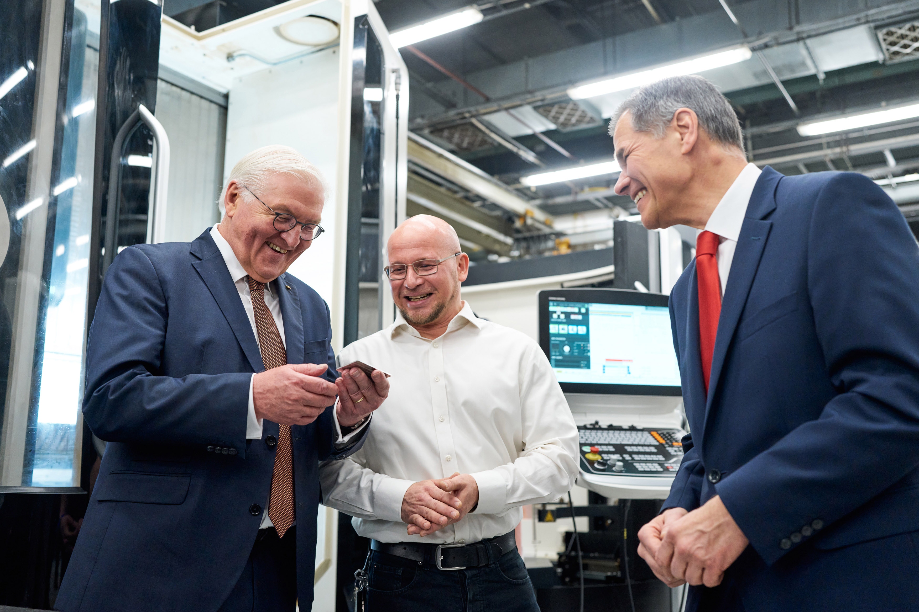 • Bundespräsident Frank-Walter Steinmeier besucht Mechanikfertigung von ZEISS in Jena: Bundespräsident, Ronny Schäfer, Leiter der Mechanikfertigung bei ZEISS in Jena, Dr. Karl Lamprecht, Vorstandsvorsitzender der ZEISS Gruppe (v.l.)