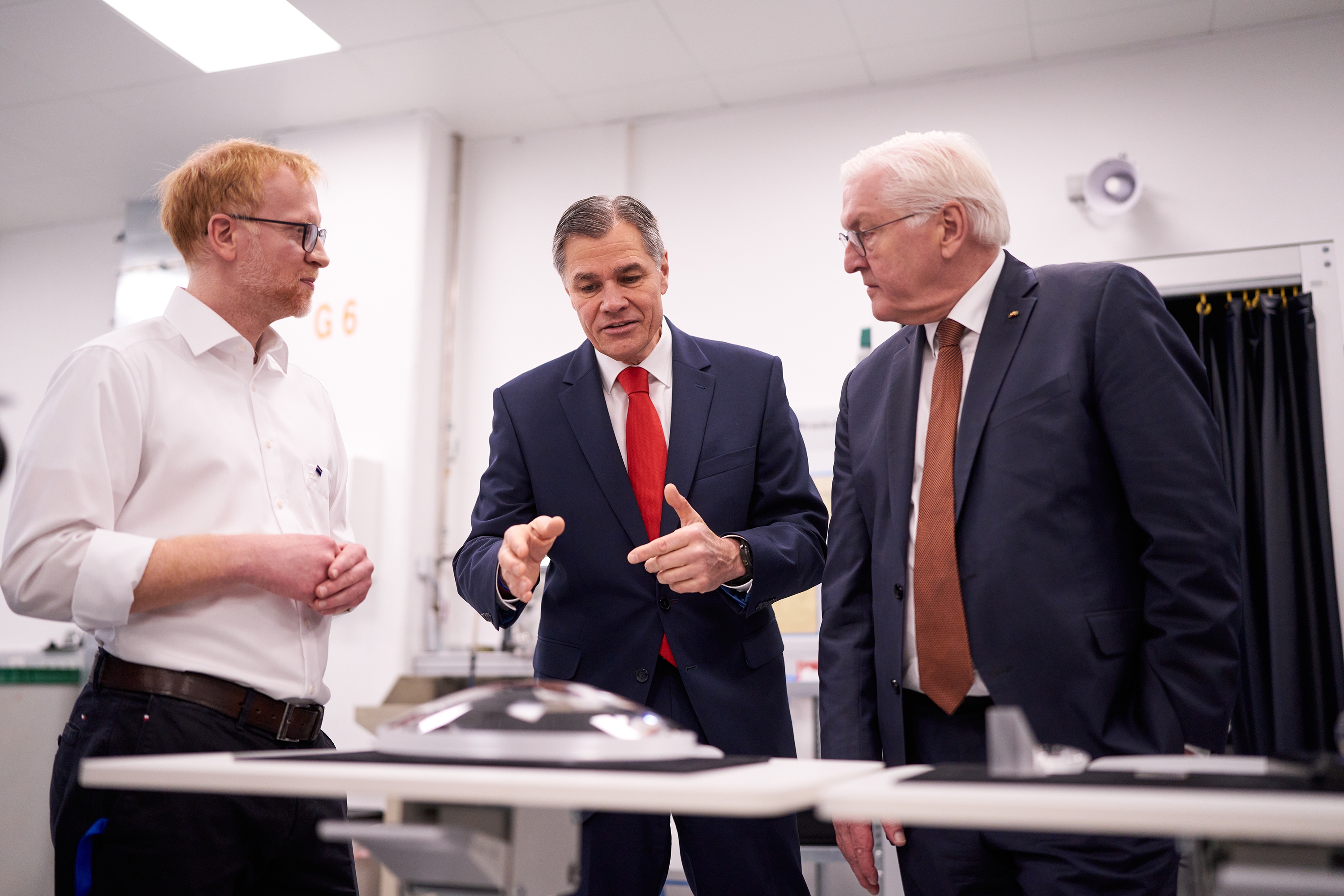 • Bundespräsident Frank-Walter Steinmeier besucht Hochleistungs-Optikfertigung von ZEISS in Jena: Tobias Ziegan, Leiter der Optikfertigung bei ZEISS in Jena, Dr. Karl Lamprecht, Vorstandsvorsitzender der ZEISS Gruppe, Bundespräsident (v.l.)