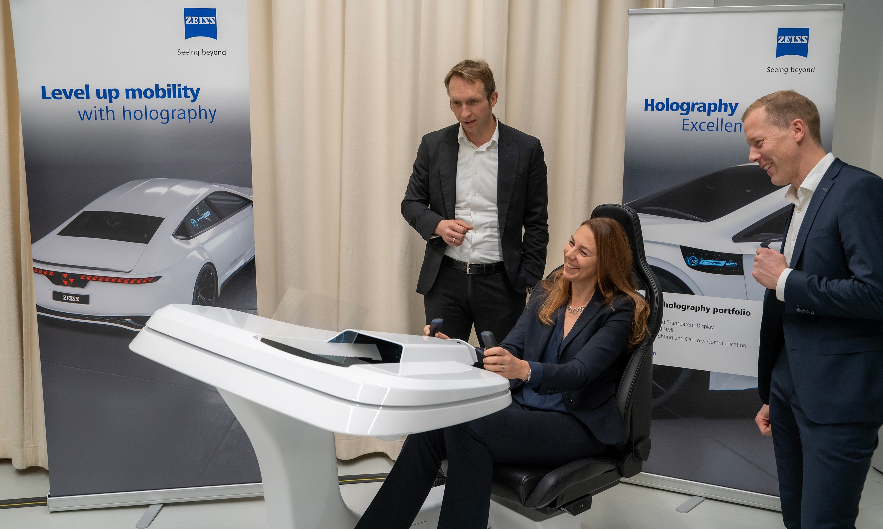 • From left: André Kutz (Head of ZEISS Photonics and Optics), Dr. Ingrid Sebald (Board Member Technology, tesa), and Dr. Roman Kleindienst (Head of ZEISS Microoptics), examining the Holographic Transparent Display for automotive applications.
