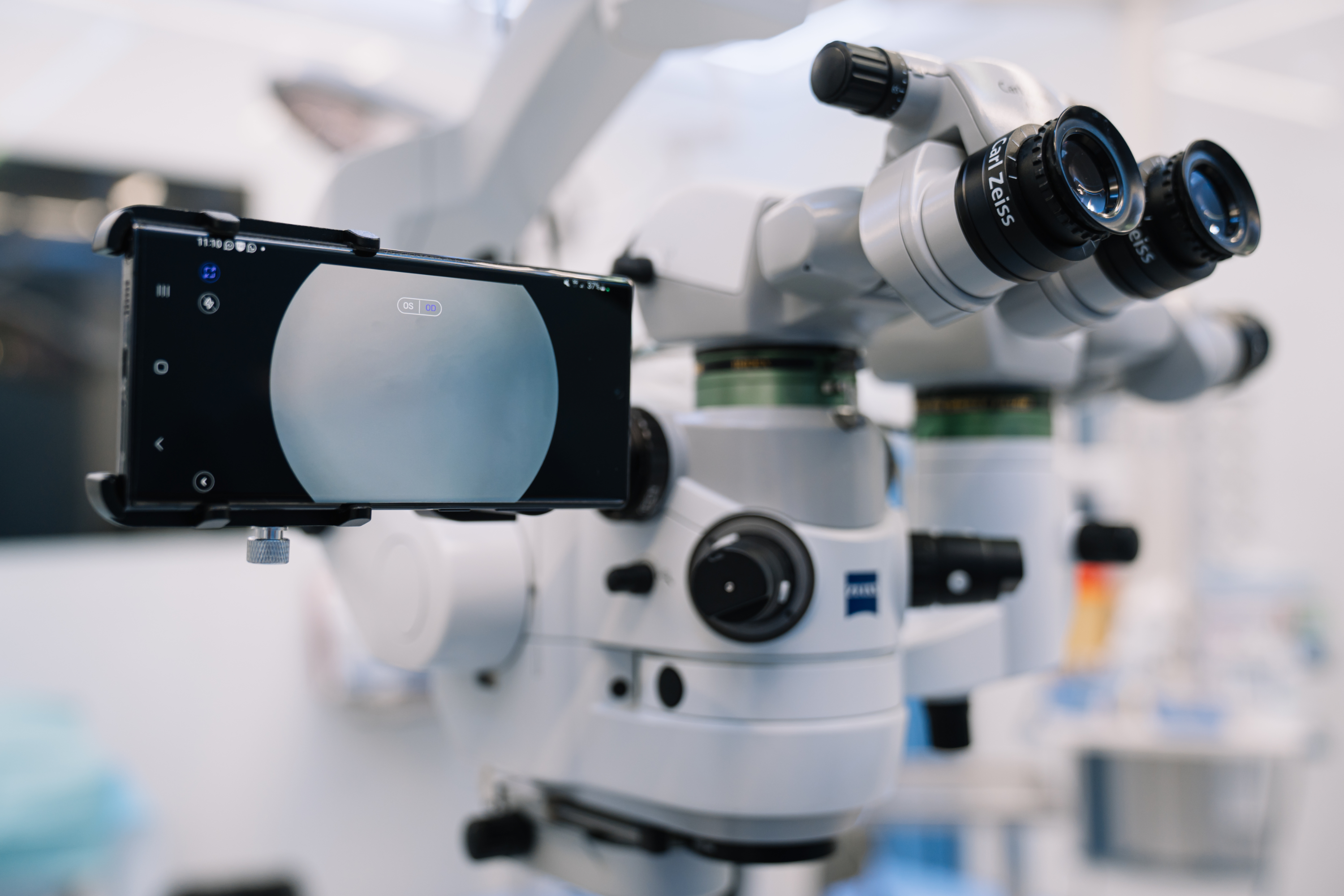 • A medical professional in an operating theater is looking through a Zeiss microscope with a smartphone attached. The environment is only partially illuminated.
