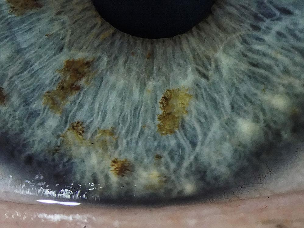 Close-up image of a human eye showing detailed iris texture and reflection, with a ZEISS lens visible.