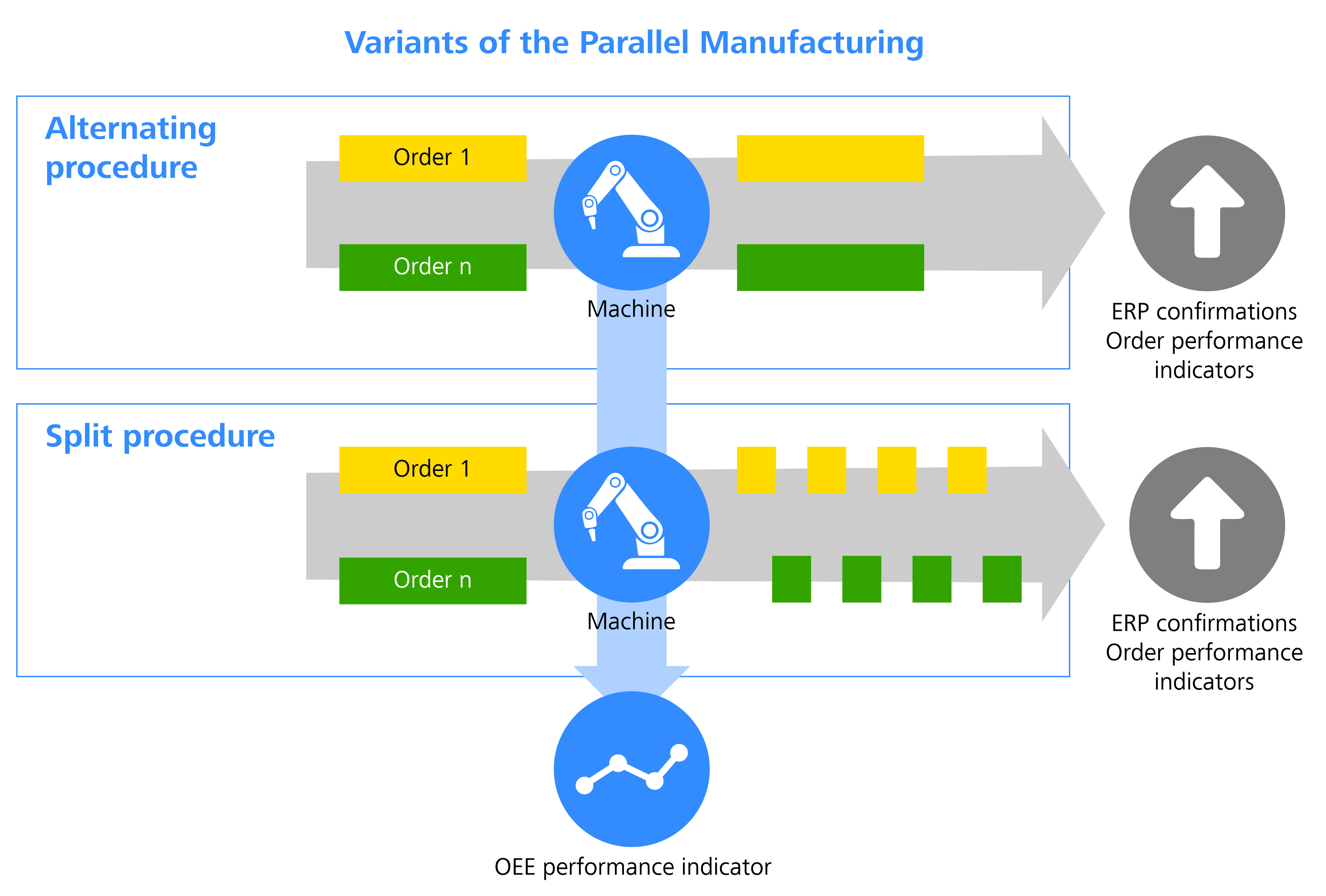 The basis for this proportion of versatility is the design of the new module. Equipped with two different scenarios: the alternating and the split scenario, the new bundle of functions can carry out several concepts of machine multiple allocation from combined or joint production up to batch manufacturing and one piece flow. While the alternating procedure means to commute between two separate manufacturing orders during the running production time (e.g. first the right bumper, then the left one), in the split method, the production cycle is split into several orders. The latter is well-known in the field of plastic injection moulding where several components with different part numbers are manufactured in a form during a cycle.
