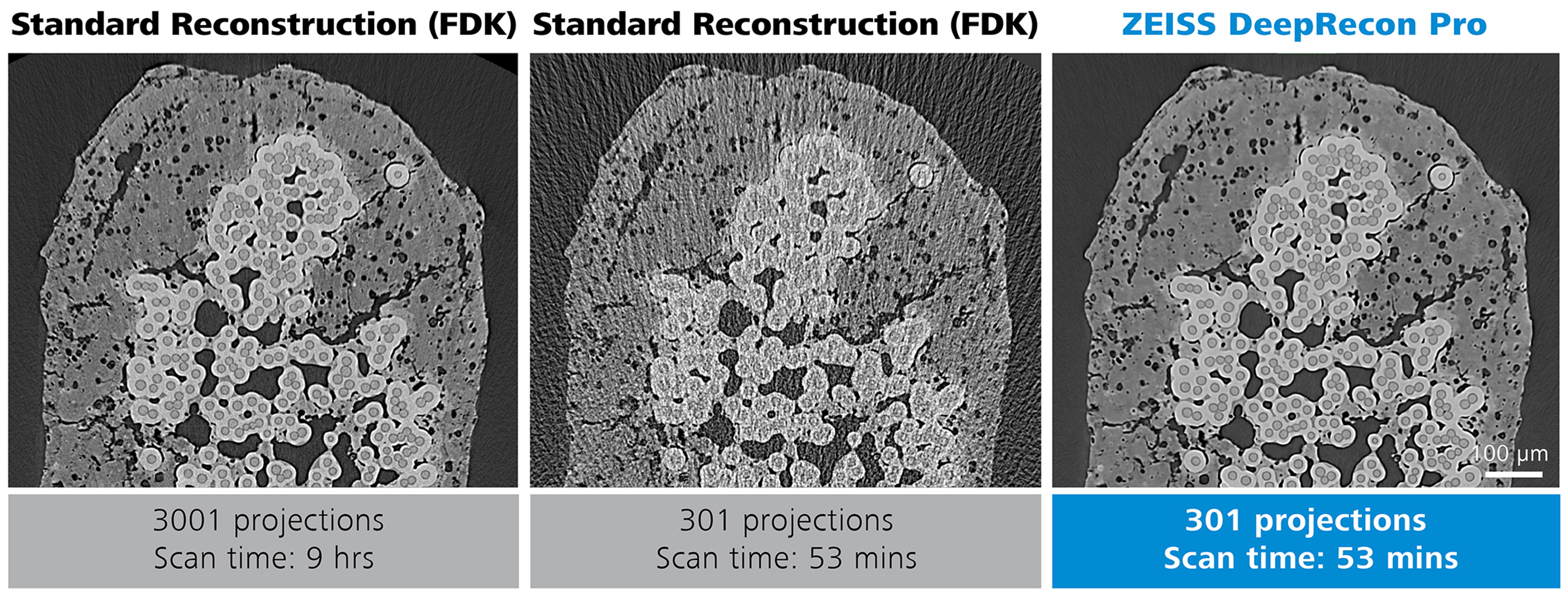 • ZEISS DeepRecon Pro used for throughput improvement for Ceramic Matrix Composite (CMC) sample, achieving 10x throughput improvement without sacrificing image quality.