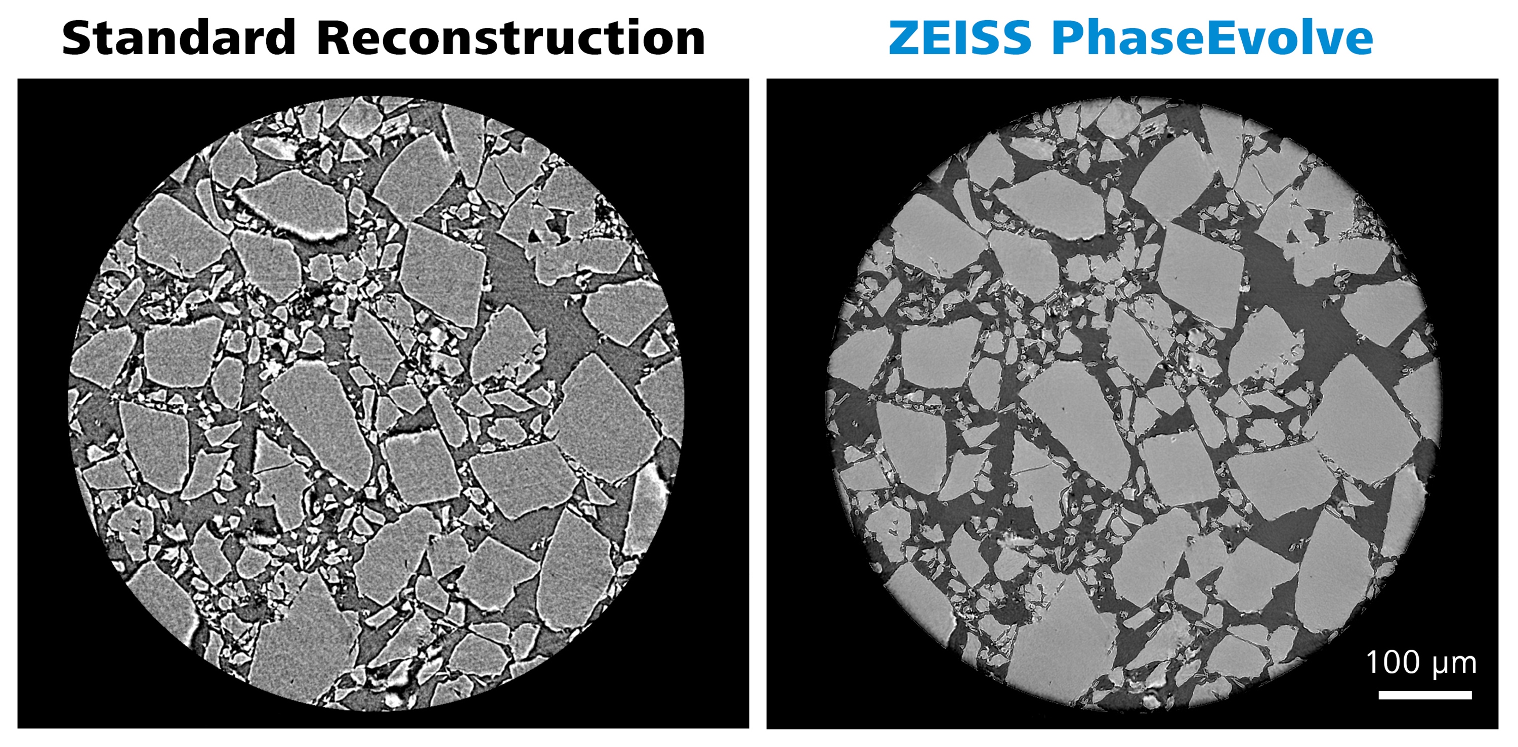 Application of ZEISS PhaseEvolve to a pharmaceutical powder sample. High resolution or low kV imaging can result in inherent material contrast being obscured by phase contrast artifacts. ZEISS PhaseEvolve effectively removes phase fringes to enhance image contrast and improve segmentation results.