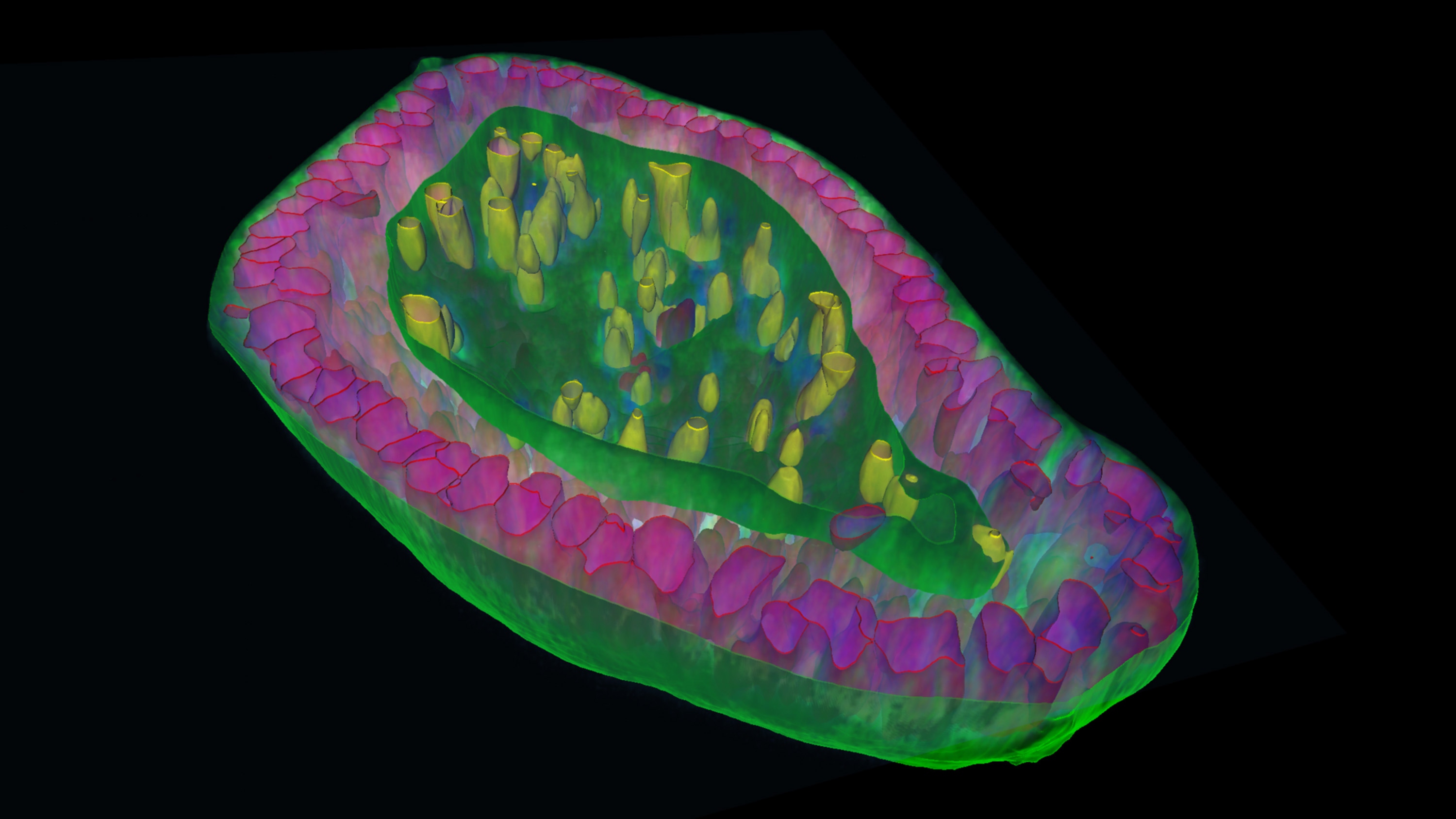 • 3D volume rendering of segmented mouse muscle ultrastructure overlaid on the original EM data.