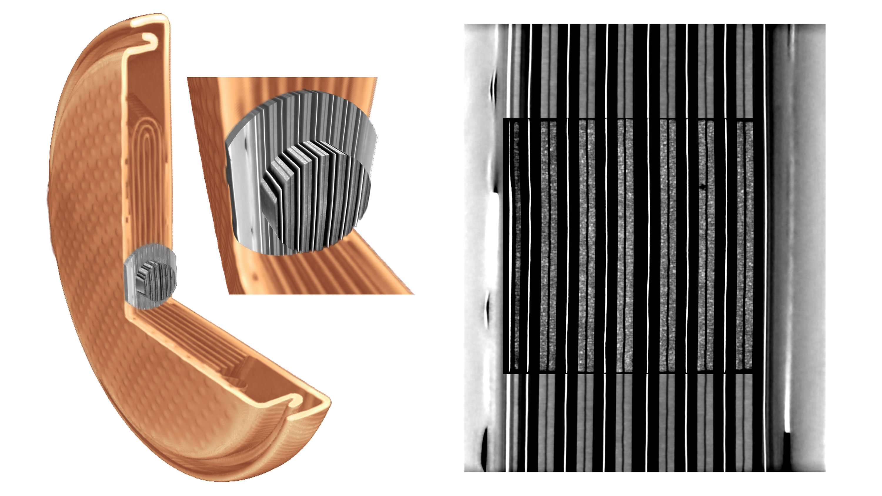 3D renderings and 2D slice view of rechargeable lithium ion 2025 coin cell battery. Using FAST Mode 1 minute quick overview scan is obtained followed by 3 μm/pixel resolution scan to resolve the layers and 1 μm/pixel resolution to image defects in the cathode and layers of the coin cell.