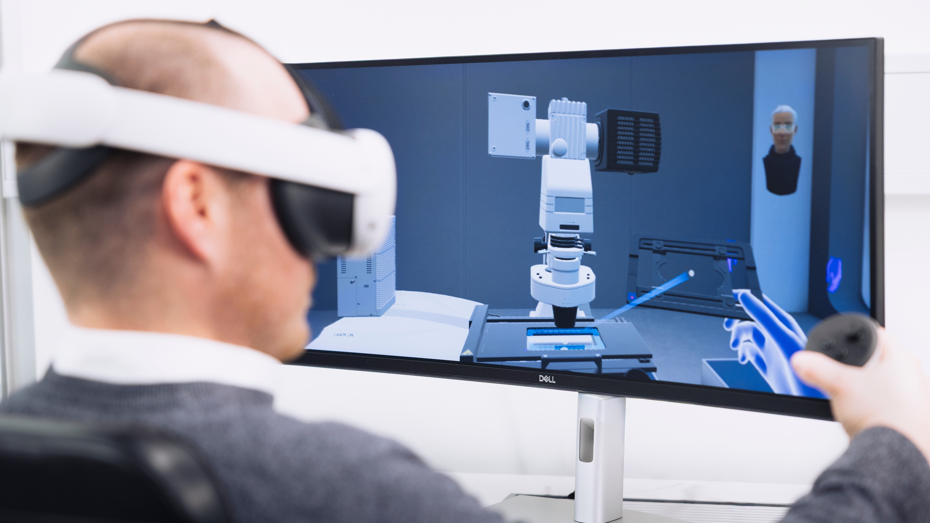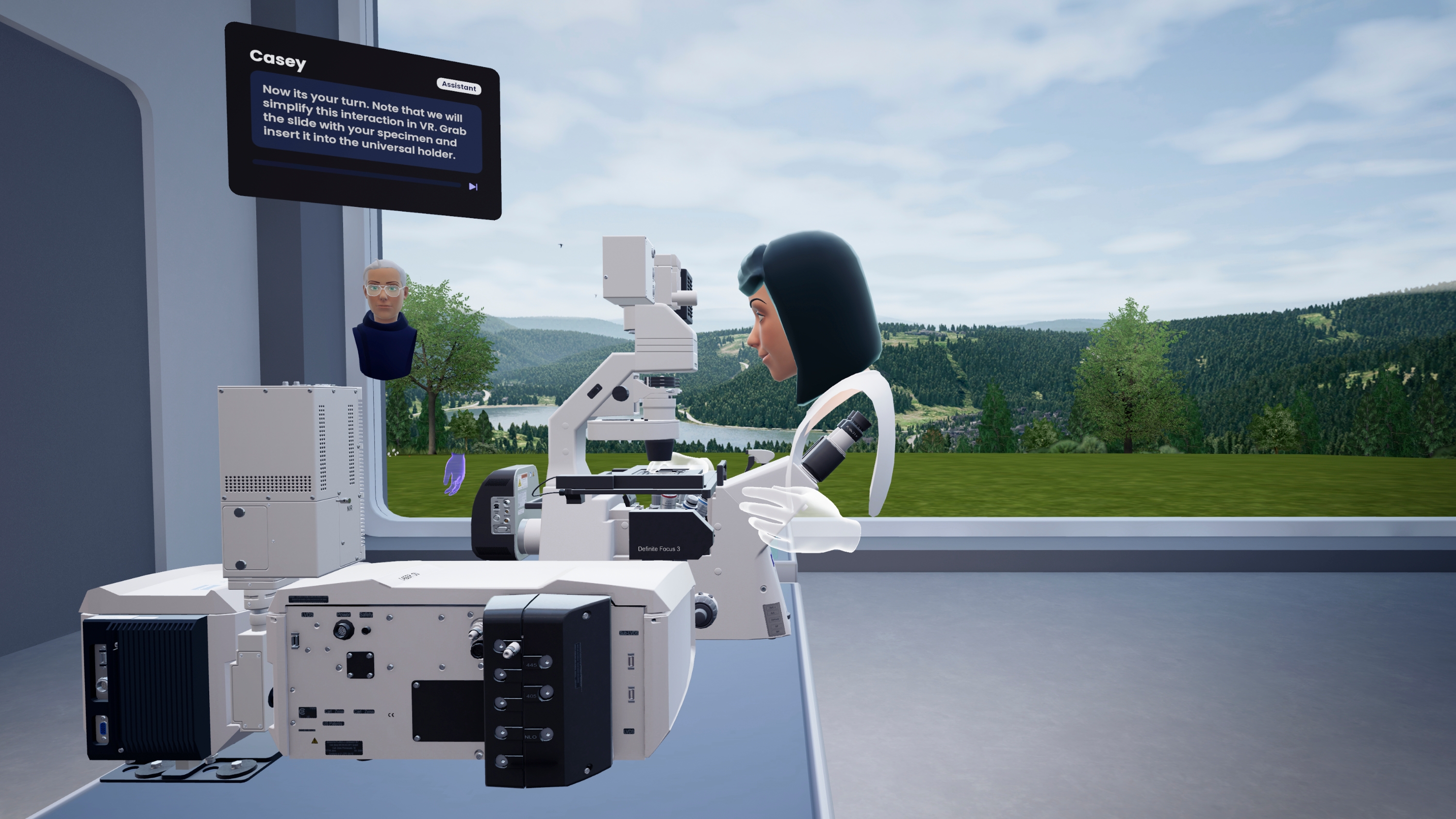 • The Zeiss Microscopy VR training environment featuring a Zeiss microscope inside a laboratory with a big window. Present inside the space are two avatars assisting in the training program.
