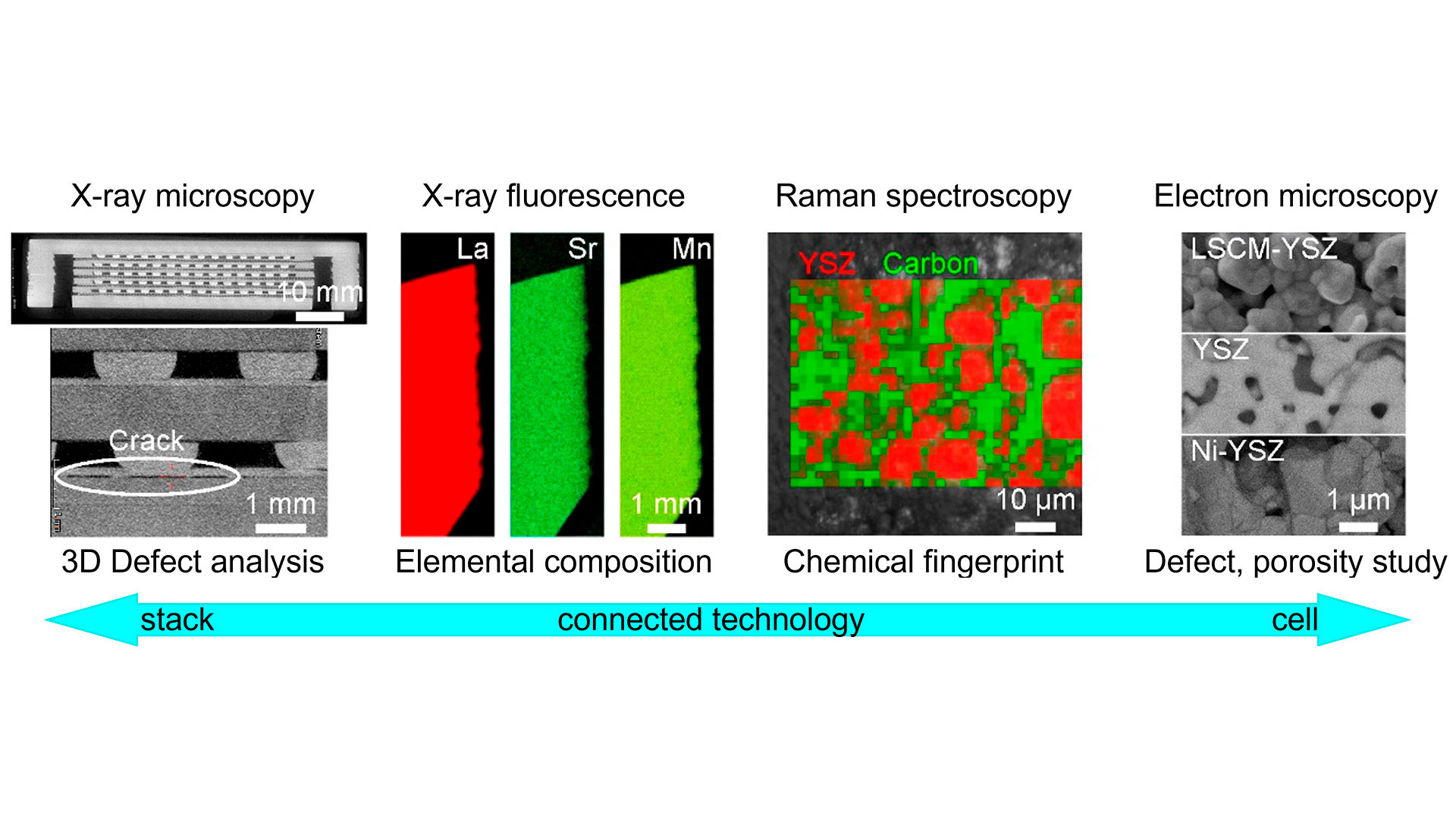 The image here shows multi-modal characterization of a solid-oxide fuel cell (SOFC) stack with unwanted cracks. SOFC electrolytes should be pore-free while the electrodes need porosity so gas can reach the catalyst. Fuel cells supplied electricity on the 1960s Apollo missions but even today improvements are needed. As SOFCs operate in severe conditions at elevated temperatures, microcracking due to thermal expansion can lead to early failure. Correlative microscopy offers a way out here because several analytical methods can be applied together in one work step.