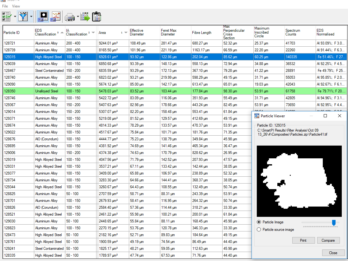 • Use the review mode to re-examine single particles and see all of their properties including EDS composition and material classification.