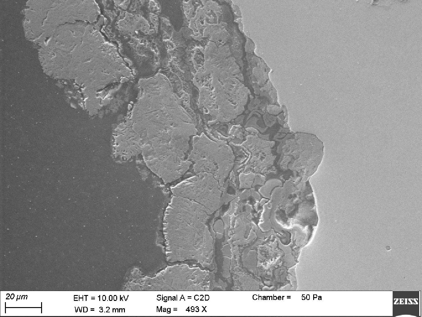 High temperature corrosion and thinning in a failed pipe, taken  with C2D detector on SIGMA 300 at 50Pa variable pressure