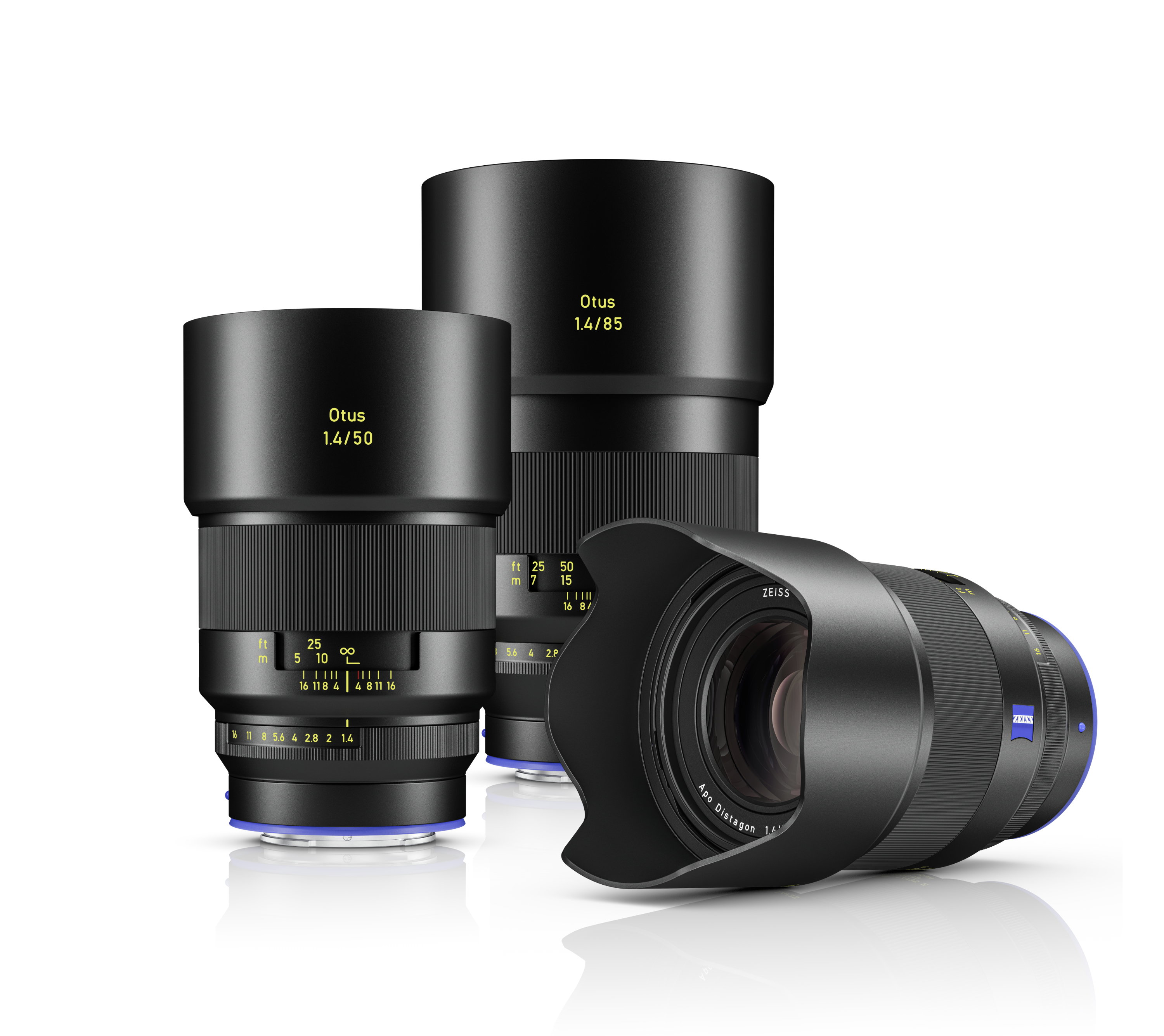 • 	 Three black camera lenses side by side on a light background, on the left a "ZEISS Otus ML 1.4/50", in the middle a larger "ZEISS Otus ML 1.4/85", and on the right the new "ZEISS Otus ML 1.4/35" in a tilted side view with a lens hood. All three lenses have yellow markings, ribbed focus rings, and a blue accent line at the mount.