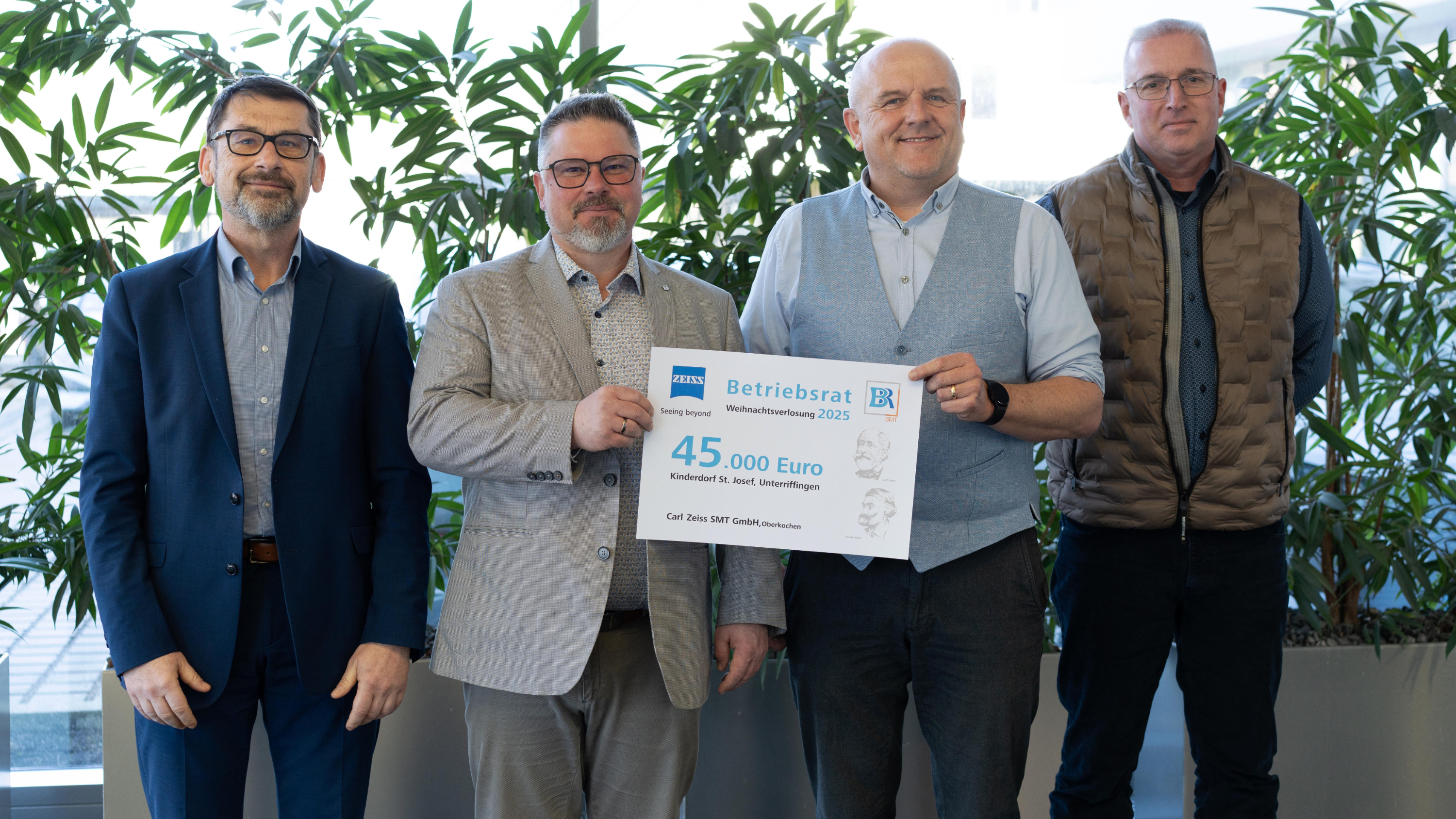 Official presentation of the donation at the ZEISS site in Oberkochen (l. to r.): Dr. Jens Werner (ZEISS SMT Management), Darius Karkoszka (Director of the St. Josef Children's Village), Artur Franzke (ZEISS SMT Worker’s Council), and Torsten Martin (ZEISS SMT Worker’s Council).
