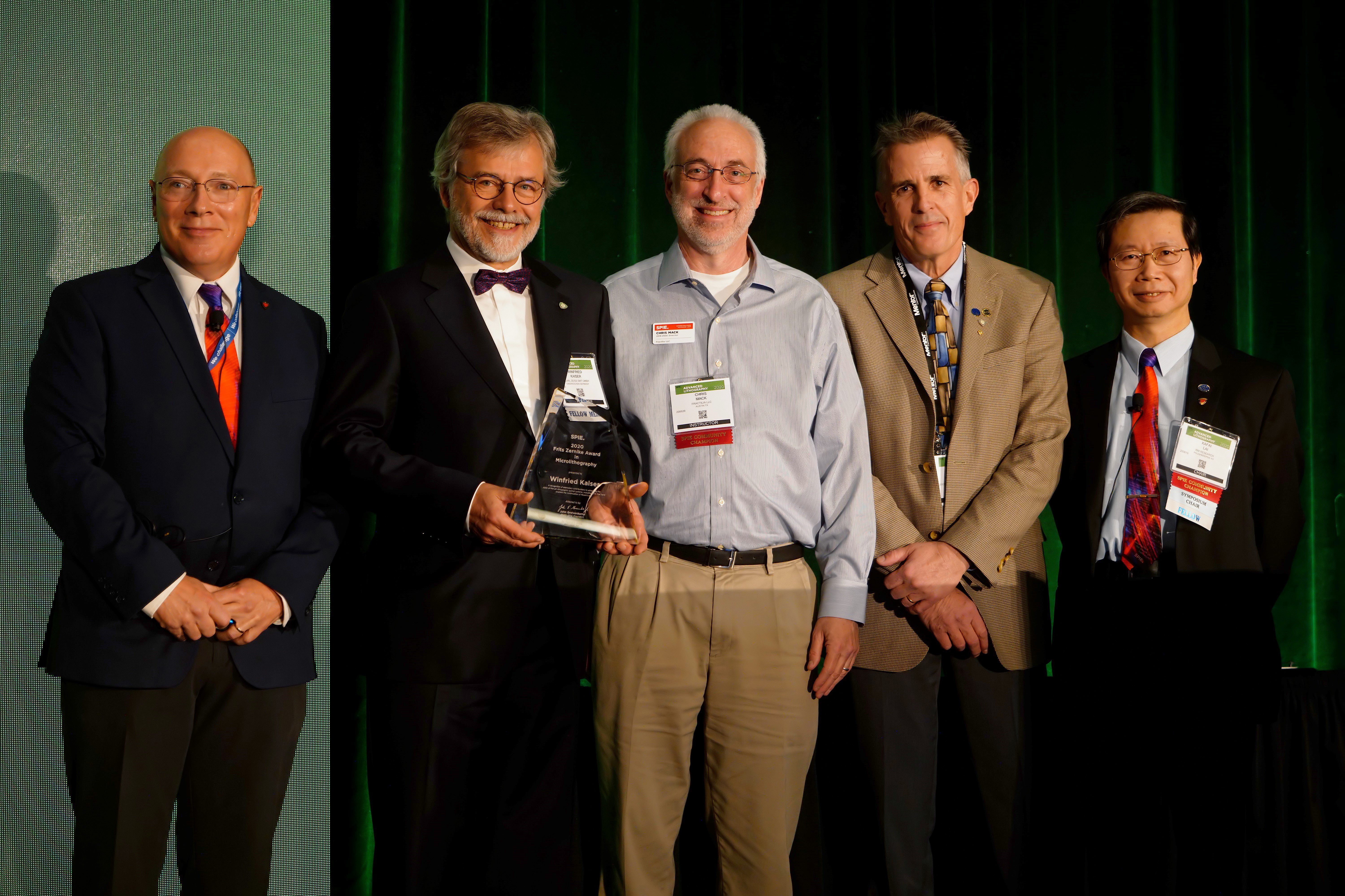 Presenting the award (from left): Will Conley, SPIE Fellow and Manager at ASML-Cymer; Winfried Kaiser; Dr. Chris A. Mack, SPIE Board of Directors and CTO of Fractilia LLC; Dr. Bruce W. Smith, SPIE Fellow and professor at the Rochester Institute of Technology; Dr. Kafai Lai SPIE Fellow and from the IBM T.J. Watson Research Center.
