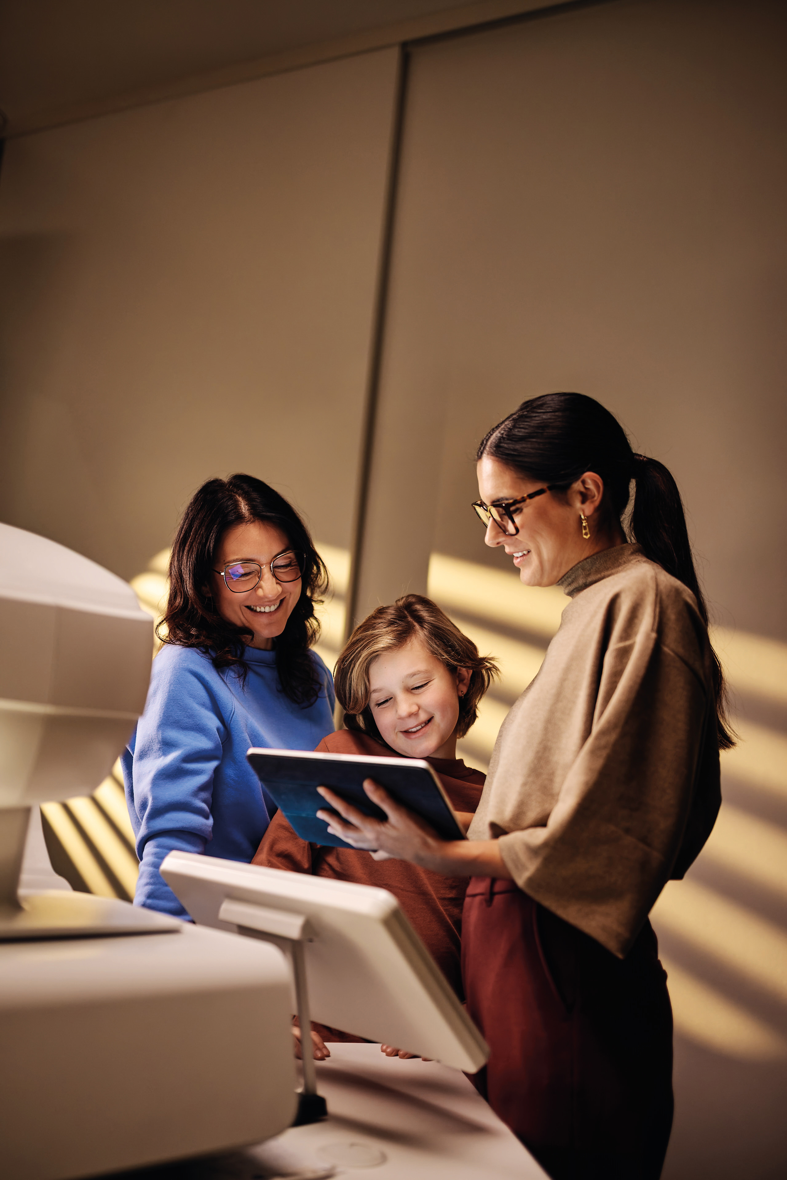 Three people looking at a tablet.
