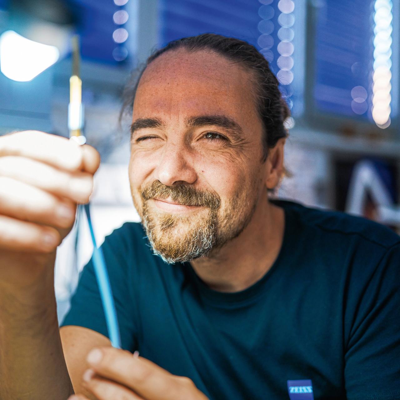 Das klingt nach einer romantischen Aufgabe. Wer möchte nicht gerne am Himmelszelt arbeiten? Dittert fasziniert das auch immer noch und immer wieder aufs Neue. Doch ihm geht es nicht um die Romantik. „Das wäre vielleicht vor rund 20 Jahren schön gewesen, wenn ich meiner Frau den Sternenhimmel so gut wie heute hätte erklären können“, räumt er ein. Heute fasziniert ihn die filigrane Technik, die in Planetarien weltweit die Sterne funkeln lässt. Daran hat er maßgeblichen Anteil. Für die neueste Generation der Sternprojektoren ZEISS ASTERION fädelt er haarfeine, nur 85 Mikrometer dünne Glasfasern in winzige Löcher ein. Jede einzelne wird später zu einem Stern in einer Planetariumskuppel. Sie muss perfekt positioniert sein, damit die Sterne in der Projektion auf Kuppeln von bis zu 18 Metern Durchmesser an der richtigen Stelle strahlen.
